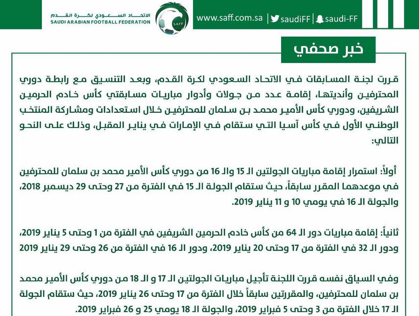 دوري المحترفين السعودي 2018–19 : جدÙÙ Ù Ø¨Ø§Ø±ÙØ§Øª اÙÙÙÙ ÙÙ Ø§ÙØ¯ÙØ±Ù Ø§ÙØ³Ø¹Ùد٠ÙÙÙ ØØªØ±ÙÙÙ ÙØªØªÙÙØ¬ اÙÙÙØ§Ù / تفاصيل محاكمة مغربيين بسبب إبتزاز مدرب المنتخب السعودي هيرفي رينارد.